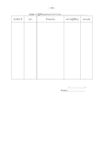 ~ 138 ~ สรุปผลการปฏิบัติงานนอกเวลาราชการ งาน………………………………........................ วัน เดือน ปี เวลา ลักษณะงาน ผลการปฏิบัติงาน หมายเหตุ (………………………........) ตำแหน่ง.........................................
